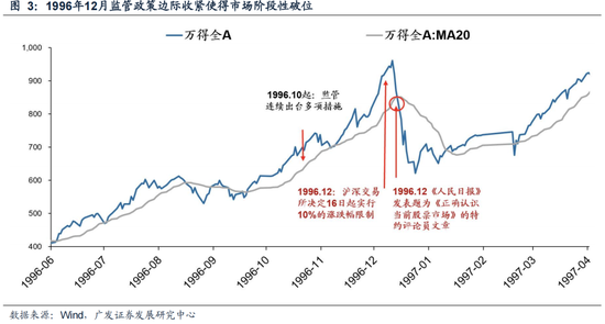 例如,1996年A股迎来第一个全面牛市,但12月经历了8个交易日的破位后的阶段性回调,原因在于市场阶段性过热后的监管收紧预期。12月13日沪深交易所决定16日起实行10%的涨跌幅限制,16日当天人民日报发表《正确认识当前股票市场》的文章,指出当前股票市场上涨是不正常和非理性的。最终市场当天起即迎来降温。