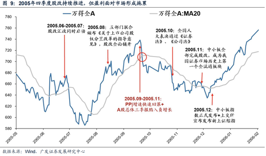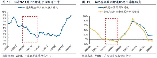 例如,2005年下半年来看,尽管股改、汇改均已启动,政策面利好,但经济及盈利压力过大,也带来了市场在9月后的回调,且回调时间达49个交易日,为11轮之最。05年经济从过热开始降温,PPI增速于9-11月开始加速下滑。且由于彼时A股周期、金融类公司占比高,受PPI拖累较大,A股总体三季报陷入了负增长,盈利面拖累市场表现,且拖累时间是11轮之最。