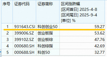 数据来源:Wind,统计区间:2025.4.8-2025.9.4。注:科创创业50指数2020-2024分年度涨跌幅为:86.90%、0.37%、-28.32%、-18.83%,13.63%,指数成份股构成根据该指数编制规则适时调整,其回测历史业绩不预示指数未来表现。
