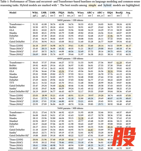 在语言建模和常识推理任务中,Titans架构在同等规模下,优于最先进的线性循环模型(如Mamba-2和Gated DeltaNet)以及Transformer++基线模型。