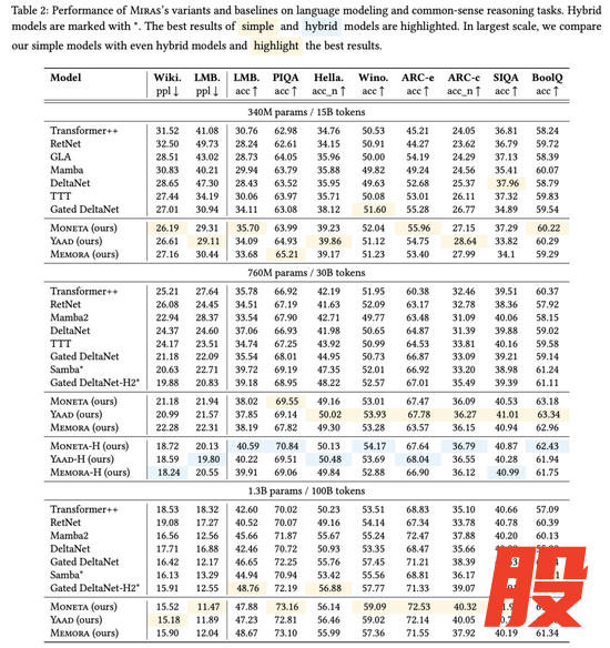 新颖的MIRAS变体(MONETA、YAAD、MEMORA)相比这些基线模型也提升了性能,验证了探索稳健的非MSE优化机制的优势。